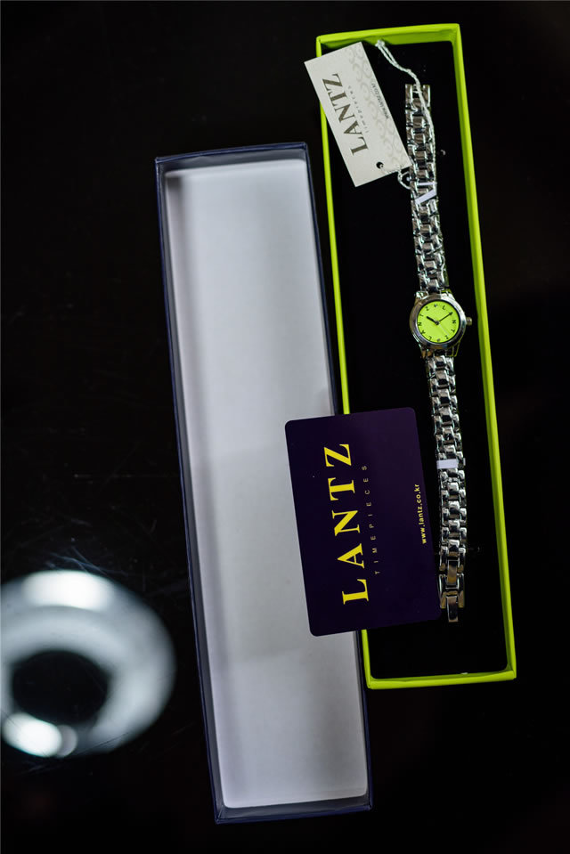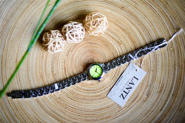 打开盒盖,附带着商标的手表被放在黑色丝绒盒底,还有品牌卡。选了自己最喜欢的黄绿色表壳。在盒盖被打开的一瞬间,黄绿色的表盘与同色盒框互相照应,格外夺目;不锈钢表带铮铮发亮;俯视下去就是这个效果。